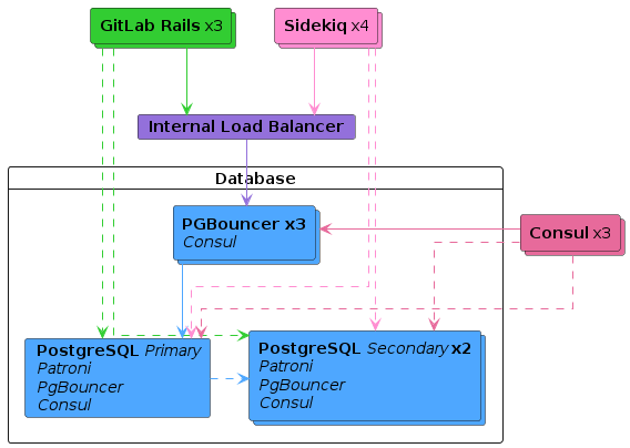 - A minimum of three PgBouncer nodes that track and handle primary database reads and writes.