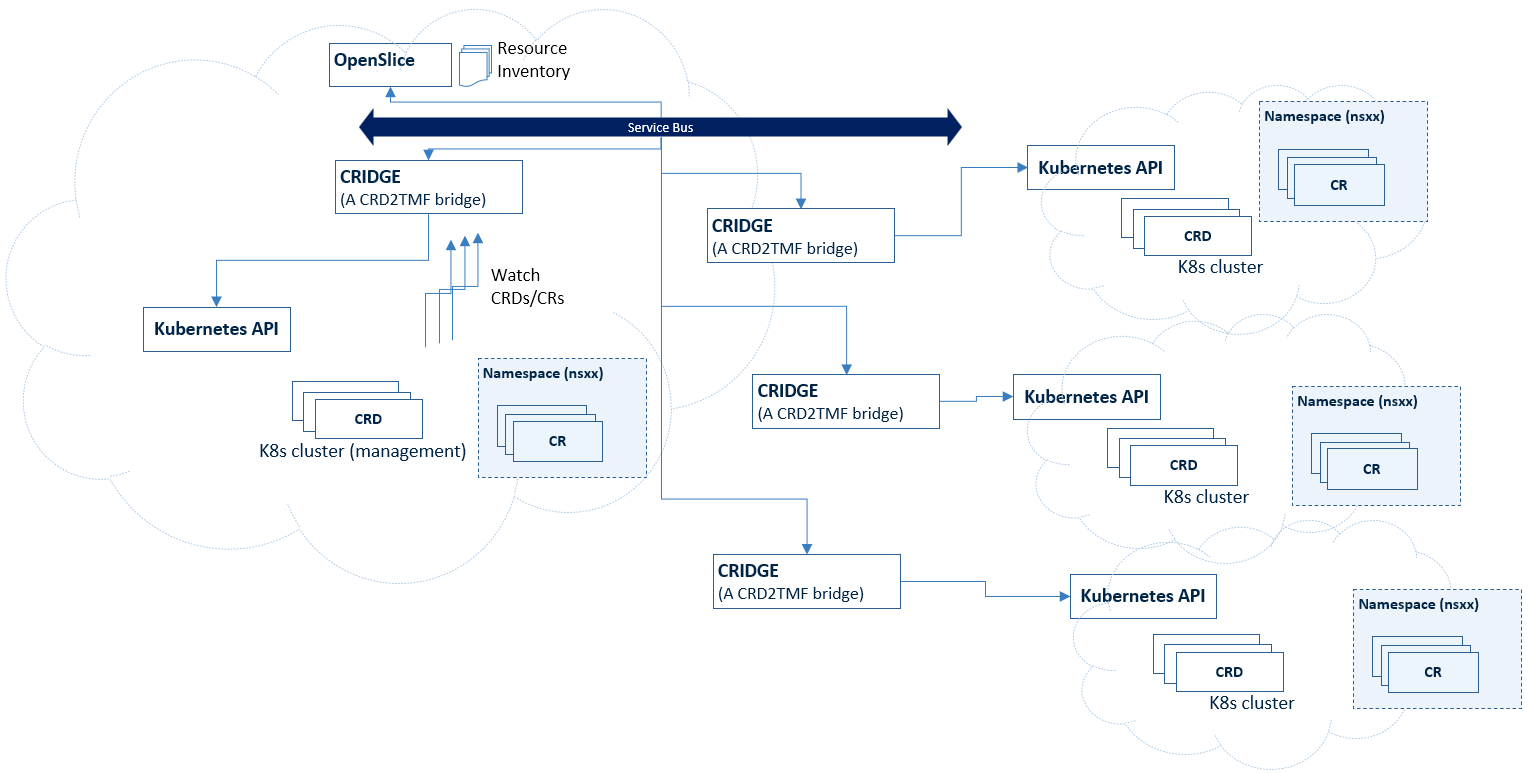 CRIDGE is a service designed to create and manage Custom Resources (CRs) based on Custom Resource Definitions (CRDs) installed on a Kubernetes cluster. By leveraging the OpenSlice (OSL), CRIDGE enables seamless integration and orchestration within Kubernetes environments, utilizing Kubernetes APIs via the TMF APIs and models. Thus, more or less, OSL exposes Kubernetes APIs as TMF APIs and models.