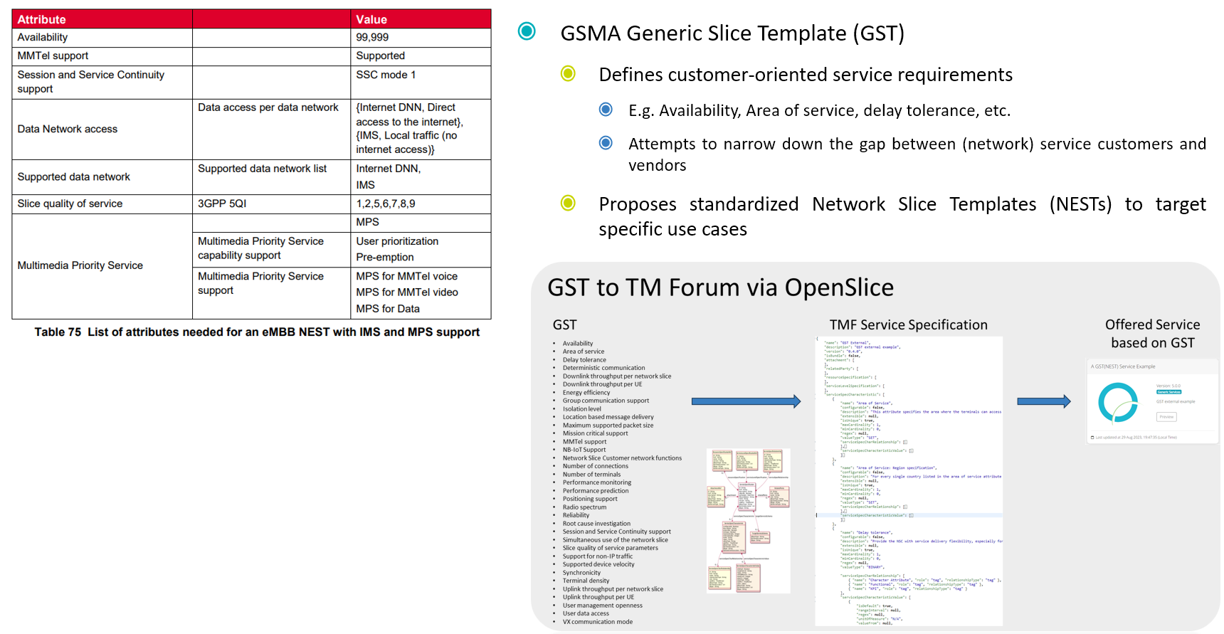 * TMF Service Specification: Demonstrates the transformation of GST attributes into a TM Forum service specification, showing JSON code snippets that define service parameters.