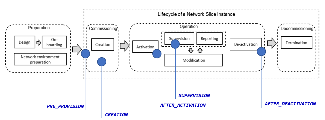 The following figure displays the different phases that the rules are performed, during the lifecycle of a Network Slice Instance.