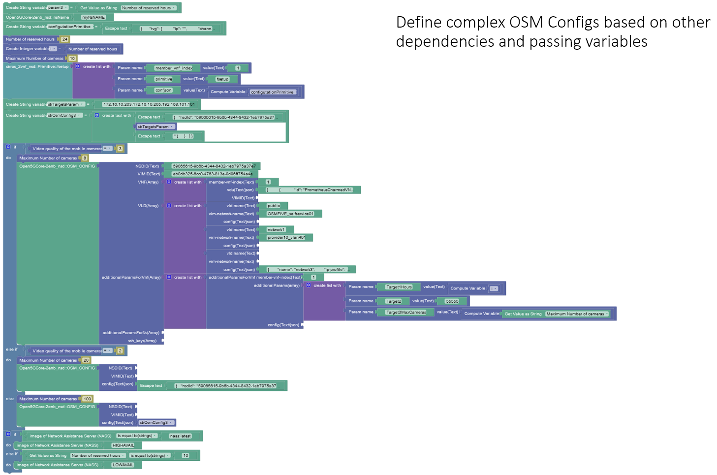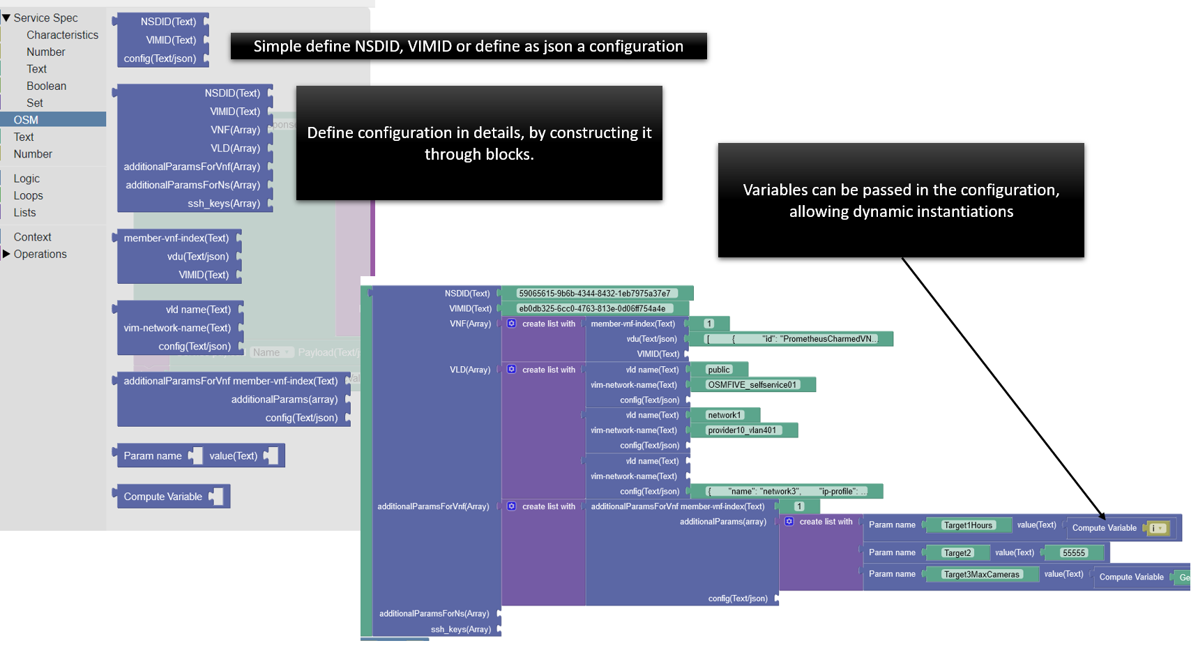 The following displays some complex examples for defining the parameters to pass to the NFV. In this case is OSM.