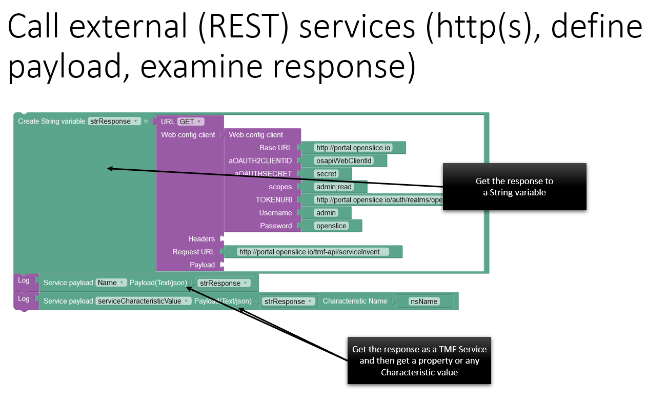 - Call external (RESTful) services (via http(s), define payload, examine response)