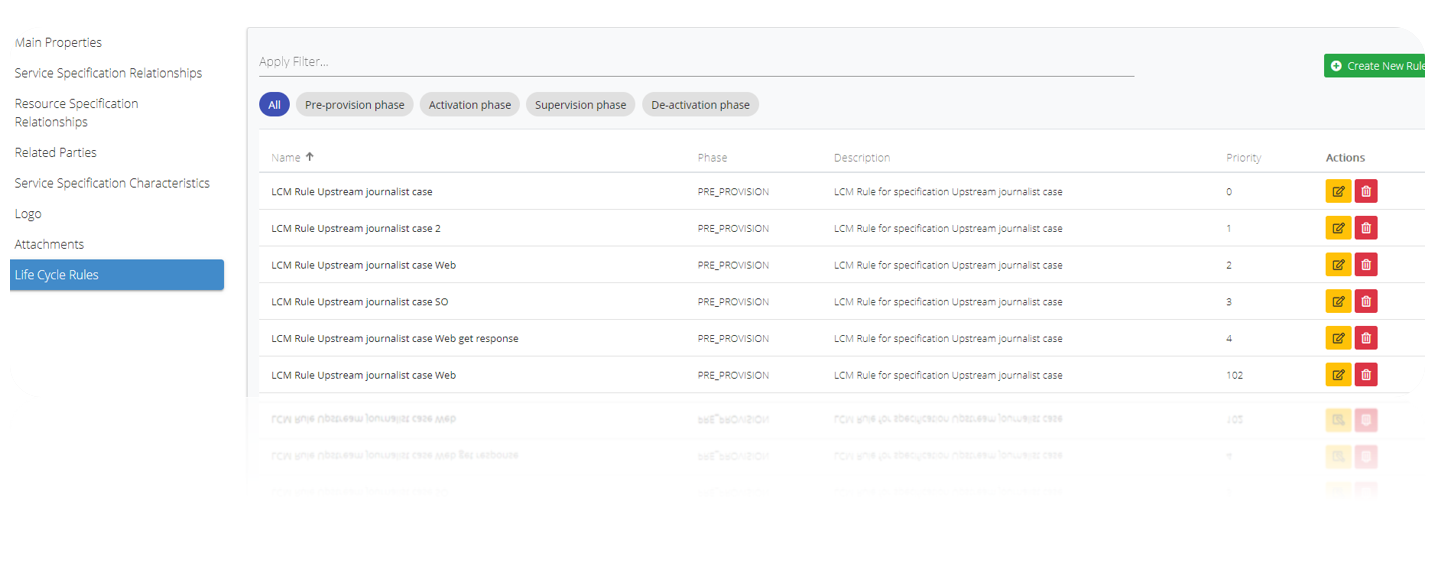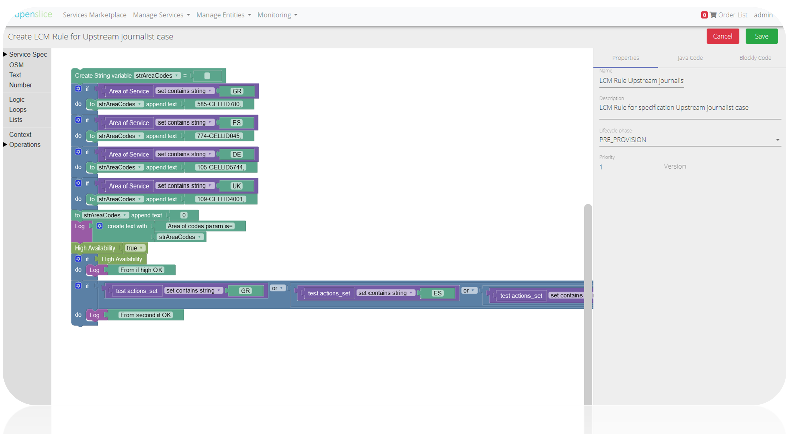 LCM Rules are used for defining complex conditions and actions during the lifecycle of a service. In Openslice there are four types of rules defined: