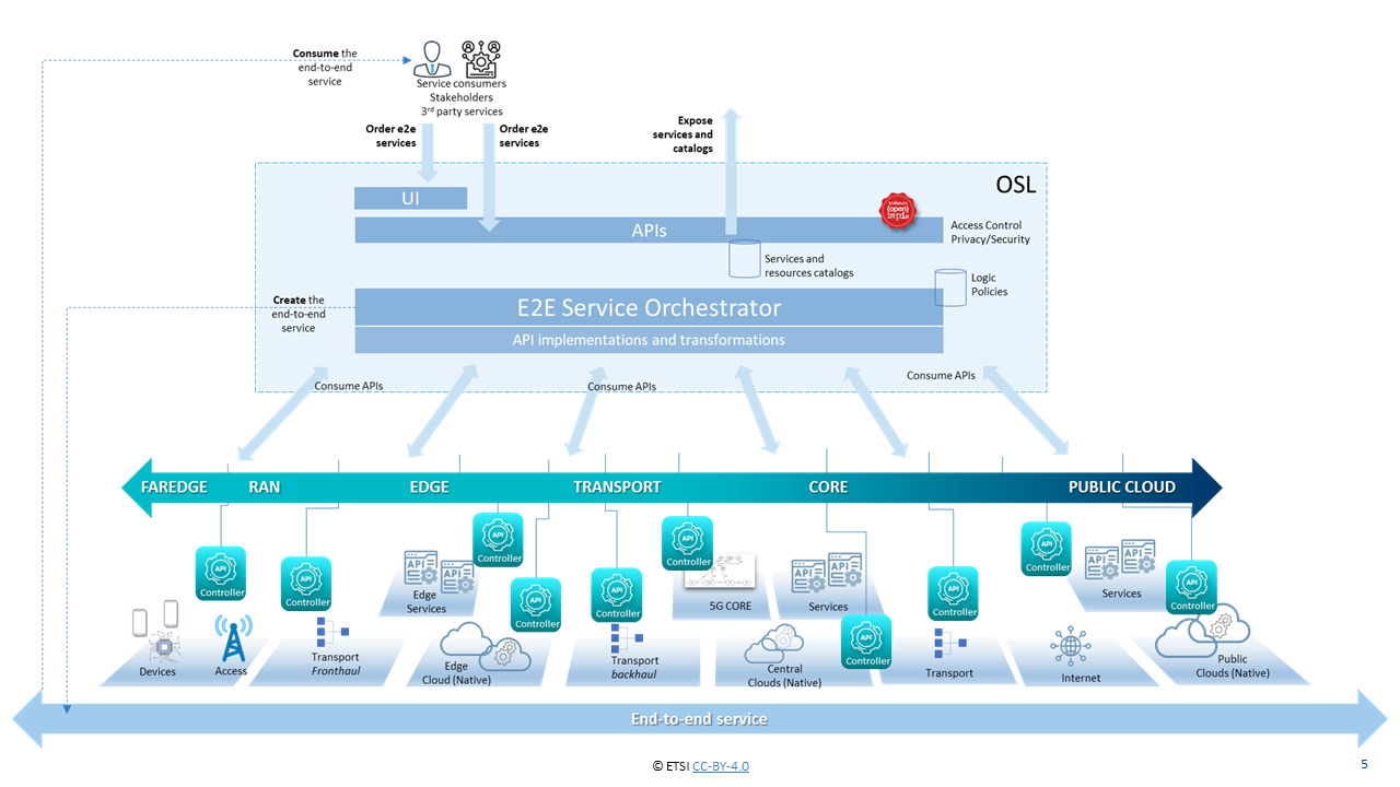 The image illustrates how OpenSlice supports the idea of an E2E network service orchestration framework by integrating multiple network components and layers, from user devices at the edge to radio, transport networks, core and public cloud services, ensuring seamless, secure, and efficient delivery of network services. Assuming that there are domain controllers for all the above domains OpenSlice can create the end-to-end service via the domain controllers by following the process of creating and deploying the end-to-end service by implementing transformations, and consuming APIs from various network entities. OpenSlice, in a nutchell, offers user interfaces where users can interact with the framework to order, expose, and manage service catalogs, services and resources that can be ordered, following business logic and policies and exposed through the APIs.