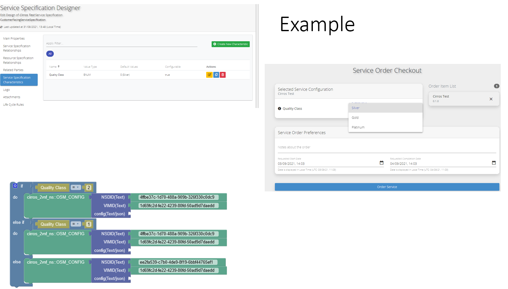 • Modify service specification parameters before the instantiation of a service (or during operation) based on other dependencies. These parameters might be part of other services already included in Service order