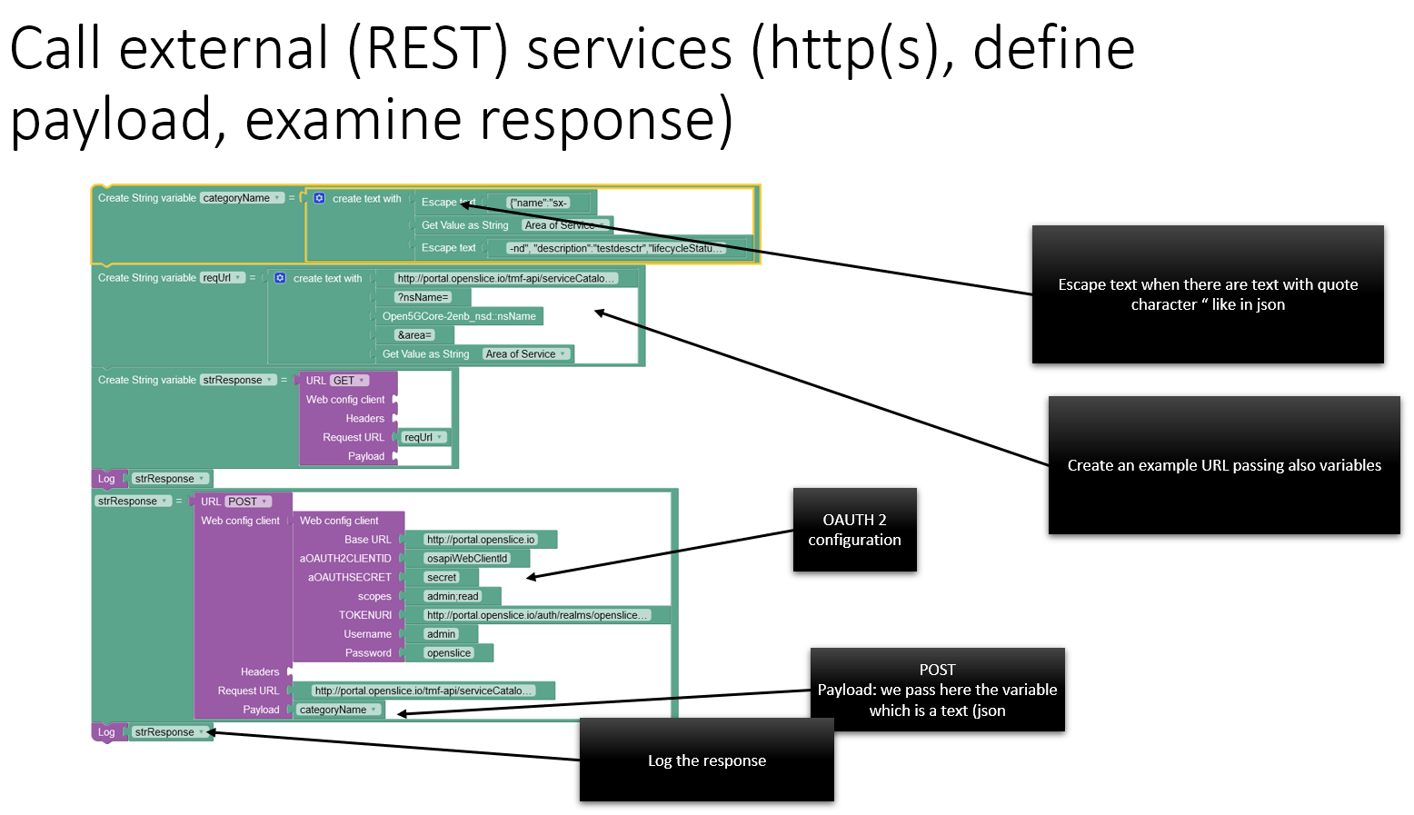 • Call external (RESTful) services (via http(s), define payload, examine response)